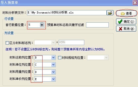 3. 在材料預(yù)算單導(dǎo)入設(shè)置窗口中設(shè)置導(dǎo)入?yún)?shù)如下: