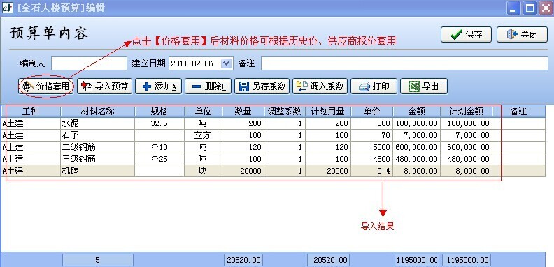 2. 在材料預(yù)算單內(nèi)容編輯窗口中,采用【導(dǎo)入預(yù)算】的功能方式。