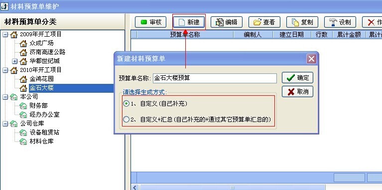 1. 打開【材料管理】模塊中【材料預(yù)算單】,選中項(xiàng)目后點(diǎn)擊【新建】按鈕創(chuàng)建材料預(yù)算單。