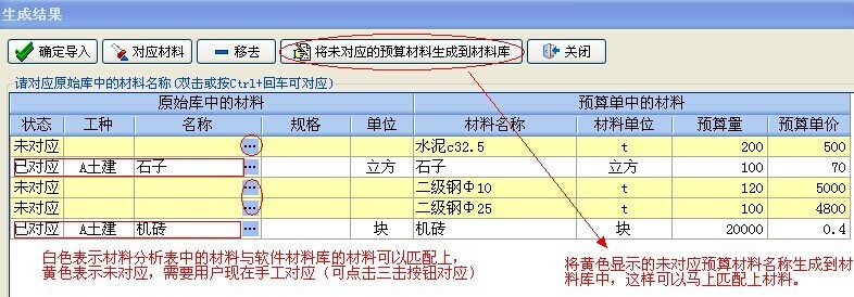 導(dǎo)入完的生成結(jié)果,(由于預(yù)算軟件中生成的材料分析表里的材料名稱與實(shí)際發(fā)生的材料名稱有些差異,這里需要用戶將未對應(yīng)的材料做下手工匹配)