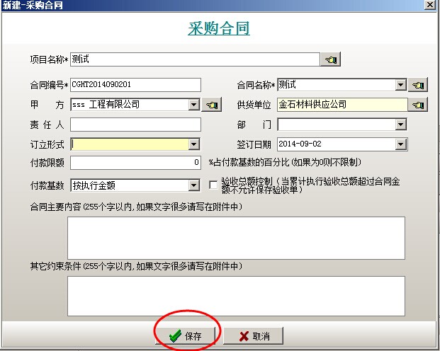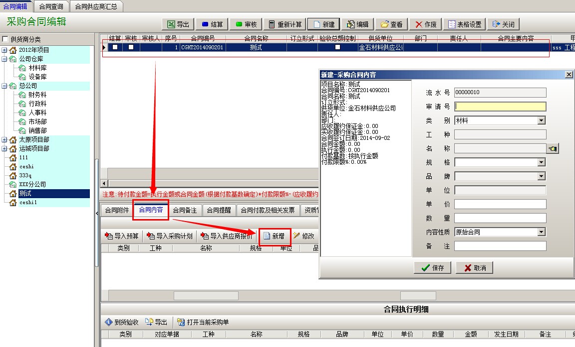 打開采購合同,左側(cè)選擇相應(yīng)的項目,右邊點新建,錄入采購合同相關(guān)信息,保存。