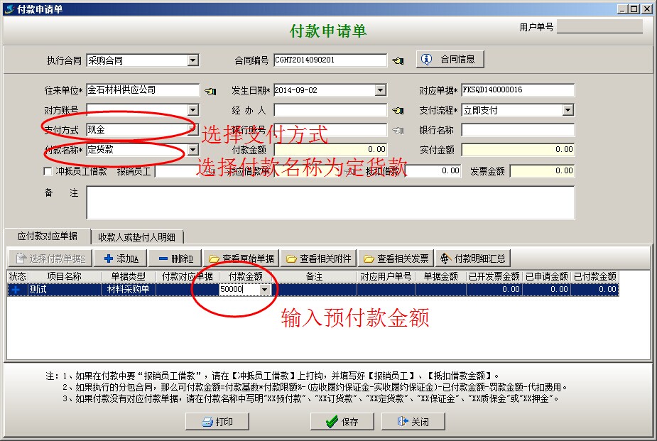 注:因為沒有到貨驗收入庫,所有付款名稱要為:“定貨款”、“訂貨款”、“預(yù)支款”、“預(yù)付款”,并且要對應(yīng)好合同編號(系統(tǒng)規(guī)定必須有合同才能做預(yù)付款或定金等付款)。