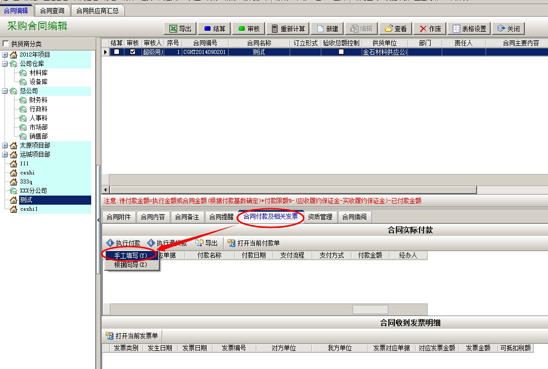 合同內(nèi)容錄入完畢,審核采購合同,在沒有執(zhí)行到貨驗收的情況下,點擊合同付款及相關(guān)發(fā)票,執(zhí)行付款,選擇手工填寫,彈出付款申請單,選擇付款方式,付款明細(xì)中輸入付款金額,然后保存 。