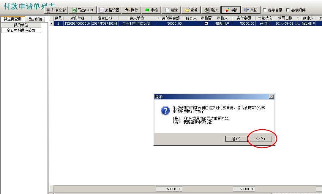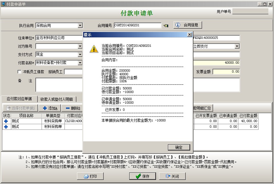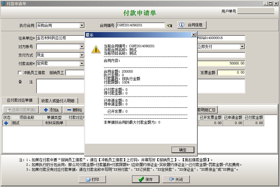備注:上圖提示為預(yù)防超額付款的合同明細(xì)提示,點確定即可。