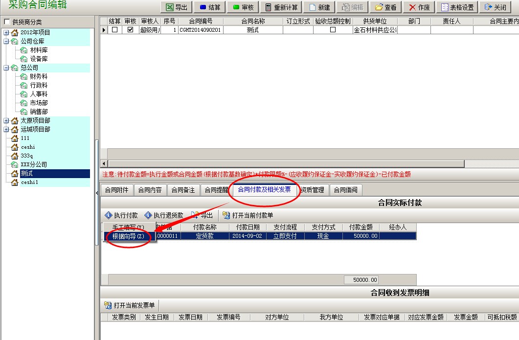 然后打開合同付款及相應(yīng)發(fā)票,點執(zhí)行付款,選擇第二項根據(jù)向?qū)?/strong>。