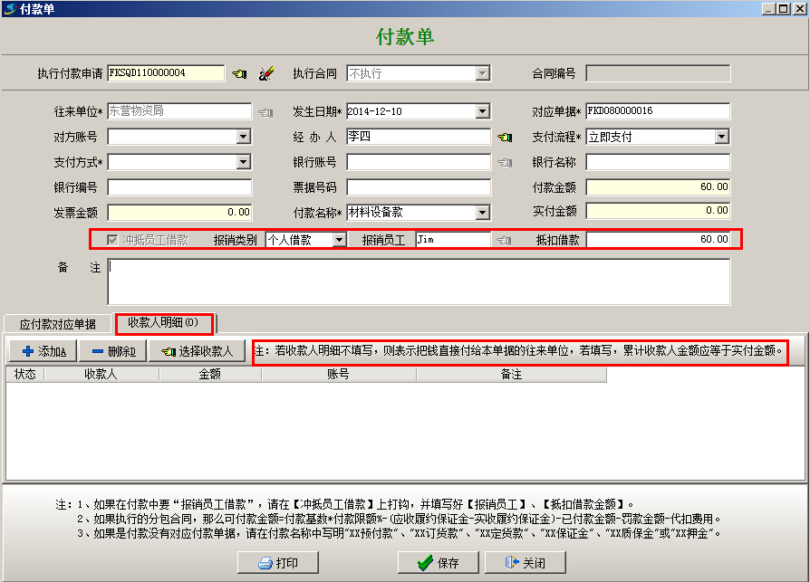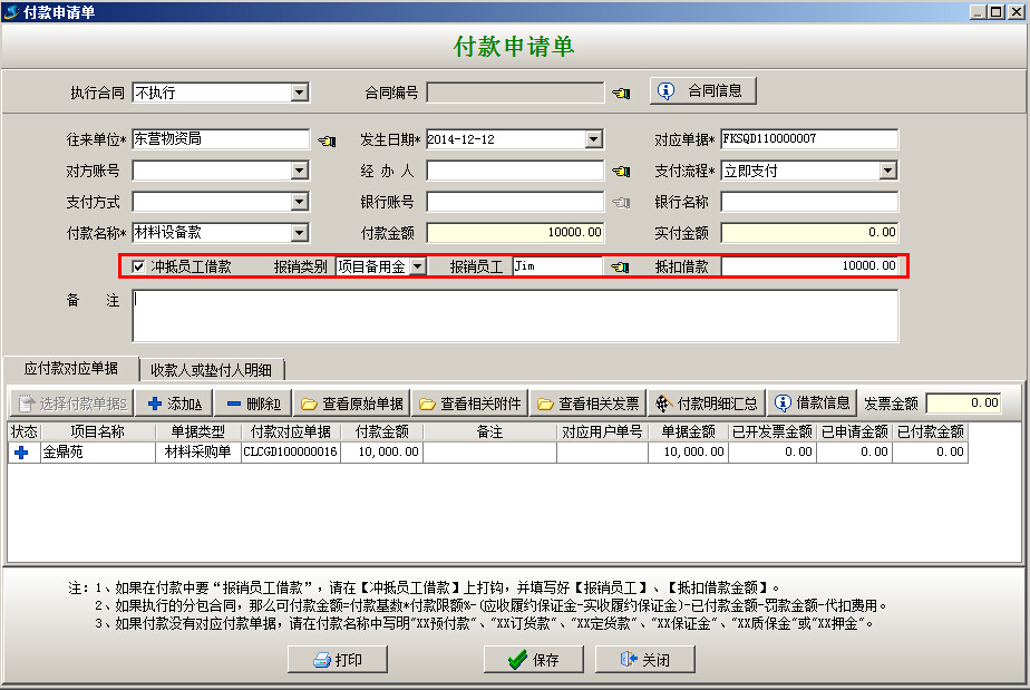 (2)本情況和(一、員工墊付)情況比較中多了前期借款步驟、后期還款步驟。中間的報銷環(huán)節(jié)基本一樣,區(qū)別在【付款申請單】和【付款單】中要選中“沖抵員工借款”選項,報銷類別選擇“個人借款”,不需要填寫“收款人明細欄目”如下圖: