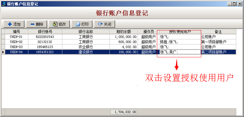 (2)讓超級用戶或總公司財務(wù)經(jīng)理在期初使用軟件時,在軟件的主菜單中【財務(wù)】->【銀行管理】->【銀行賬戶信息登記】中建立總公司賬戶和項目部(或子公司)賬戶,其中總公司銀行賬戶的授權(quán)使用人要設(shè)置為總公司的相關(guān)財務(wù)人員和總經(jīng)理,項目部(或子公司)賬戶的授權(quán)使用人要設(shè)置為總公司和該項目部(或子公司)的相關(guān)財務(wù)人員和經(jīng)理,這樣總公司人員不但能查詢總公司的銀行資金流水還能監(jiān)控到各項目部的流水,項目部(或子公司)只能查看自己的資金流水。如下圖: