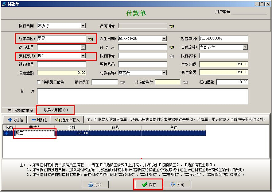 (5)因為錢是直接給的員工,所以在做【付款申請單】或【付款單】時,注意“收款人明細”中寫名收款為墊付的員工。往來單位要寫明真實單位,如果是不具名的單位,可以提前在基礎(chǔ)信息的【往來單位維護】中添加一個名稱為“零星”的單位,統(tǒng)一處理類似費用的支出。如下圖: