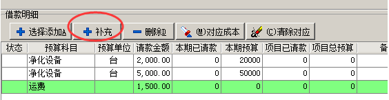 在請款過程中, 如果出現(xiàn)預(yù)算以為的請款,如:運費、裝卸費等,可以利用補充按鈕來進行補充。