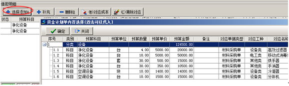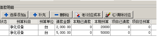 例如下圖所示:預(yù)算分類為設(shè)備,明細科目為凈化設(shè)備,對應(yīng)的名稱可以為高效過濾器、移動式消毒車、烘手器等。