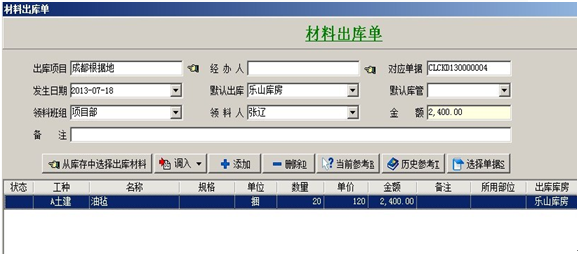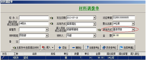 3. 【材料調(diào)撥單】主要用于:項(xiàng)目與項(xiàng)目之間的材料調(diào)撥,或公司總庫(kù)與項(xiàng)目之間的材料調(diào)撥。在填寫(xiě)時(shí)要選擇好調(diào)出項(xiàng)目和調(diào)入項(xiàng)目。調(diào)出項(xiàng)目有兩種出場(chǎng)方式:庫(kù)房調(diào)出和班組繳料,調(diào)入項(xiàng)目有兩種進(jìn)場(chǎng)方式:調(diào)撥入庫(kù)和直進(jìn)項(xiàng)目。進(jìn)場(chǎng)方式選擇直進(jìn)項(xiàng)目時(shí),明細(xì)中的材料金額會(huì)進(jìn)入調(diào)入項(xiàng)目的成本中。如果調(diào)出項(xiàng)目,出場(chǎng)方式選擇的是班組繳料,也就是從項(xiàng)目現(xiàn)場(chǎng)直接調(diào)出的,這時(shí)調(diào)出項(xiàng)目的成本中會(huì)減去明細(xì)中材料的金額。