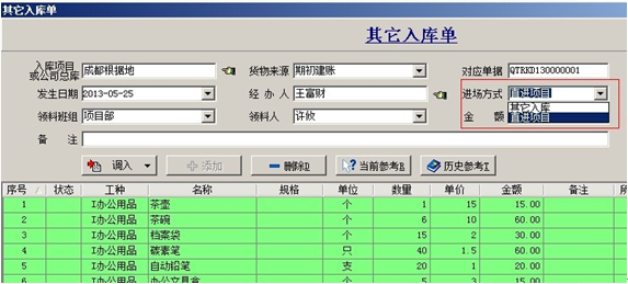 1. 【其他入庫(kù)單】一般用在期初庫(kù)存輸入或材料來(lái)源不牽扯應(yīng)付賬款的情況。在填寫(xiě)其他入庫(kù)單時(shí)進(jìn)場(chǎng)方式選擇:直進(jìn)項(xiàng)目,那么單據(jù)明細(xì)中材料的金額會(huì)直接進(jìn)入單據(jù)所選擇的項(xiàng)目成本中。如果選擇了其他入庫(kù),那么這批材料的金額不會(huì)直接反映到項(xiàng)目成本中,這批材料必須出庫(kù)后才會(huì)進(jìn)入項(xiàng)目成本(這批材料的成本以出庫(kù)時(shí)所填寫(xiě)單據(jù)中的金額為準(zhǔn))。
