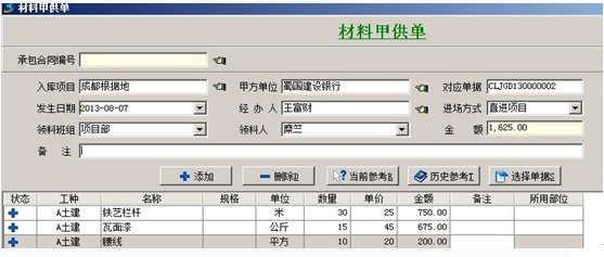 2. 【材料采購(gòu)單】也稱(chēng)為:材料驗(yàn)收單、材料入庫(kù)單,是材料采購(gòu)時(shí),材料到達(dá)現(xiàn)場(chǎng)后要填寫(xiě)的單據(jù)。在單據(jù)填寫(xiě)時(shí)進(jìn)場(chǎng)方式分為:采購(gòu)入庫(kù)和直進(jìn)項(xiàng)目。與其他入庫(kù)單相同,進(jìn)場(chǎng)方式選擇直進(jìn)項(xiàng)目時(shí),明細(xì)中的材料金額會(huì)直接進(jìn)入單據(jù)所選的項(xiàng)目成本中。