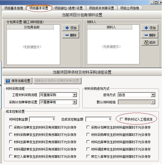 (二)、甲供材料,是項(xiàng)目所用材料由甲方公司提供。在默認(rèn)情況下甲供材不會(huì)統(tǒng)計(jì)入項(xiàng)目成本,如果用戶希望甲供材統(tǒng)計(jì)入項(xiàng)目成本,必須在項(xiàng)目維護(hù)中把相關(guān)開(kāi)關(guān)打開(kāi),如下圖: