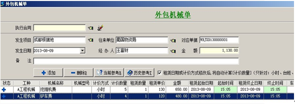 1. 【外包機(jī)械成本】一般用于統(tǒng)計工程中,租用的吊車、鏟車、挖機(jī)等大型機(jī)械設(shè)備所產(chǎn)生的成本。成本根據(jù)外包機(jī)械單來統(tǒng)計。