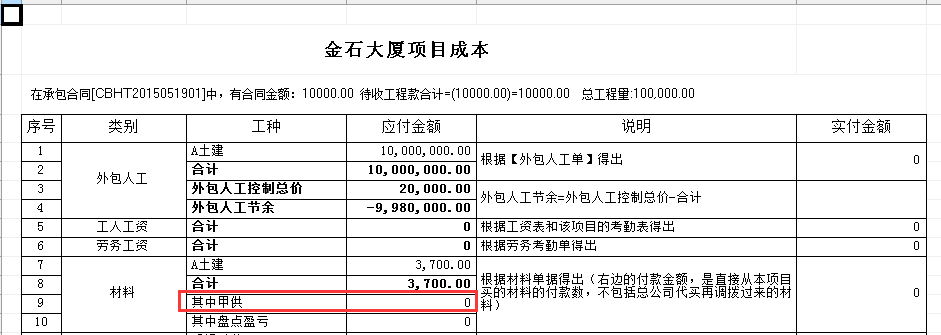 當(dāng)不勾選上甲供材計入工程成本時,甲供材這顯示為0。如下圖: