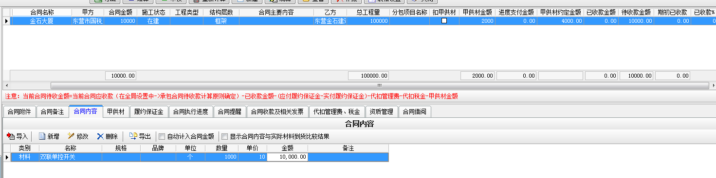 例如我們做一個合同金額為10000的承包合同,其中在工程甲供材料管理中甲供材約定金額為4000。如下圖