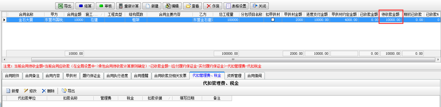 在工程項目資質(zhì)掛靠管理中因為借用乙方B的資質(zhì),需要扣除管理費,如果需要乙方B代開發(fā)票還需要扣除稅金。在承包合同中[代扣管理費稅金]模塊下操作,如下圖: