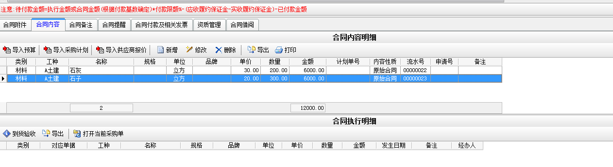 例如我們做一個(gè)采購石灰和石子的采購合同,合同總價(jià)為12000。如下圖;