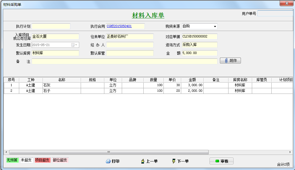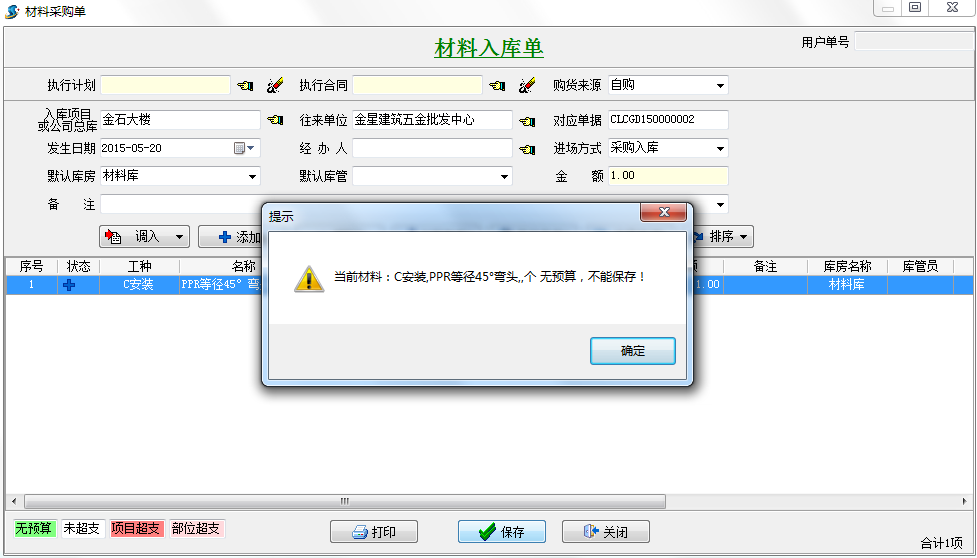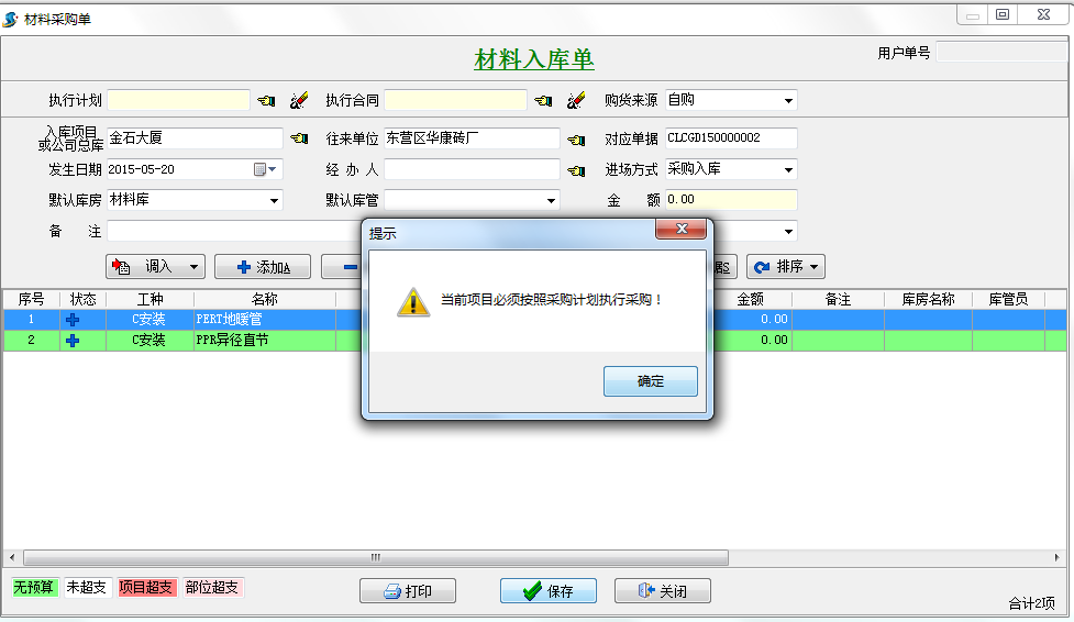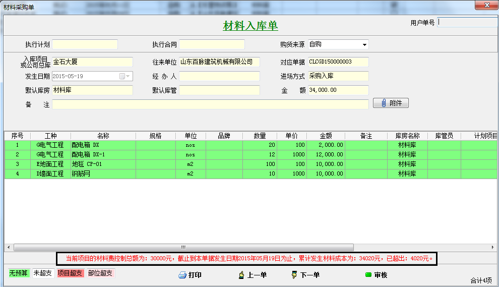 在填寫工程項(xiàng)目采購計(jì)劃單,材料入庫單,材料出庫單,材料調(diào)撥單時(shí)都會(huì)根據(jù)預(yù)算單來進(jìn)行相應(yīng)的顏色提示。