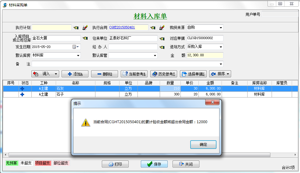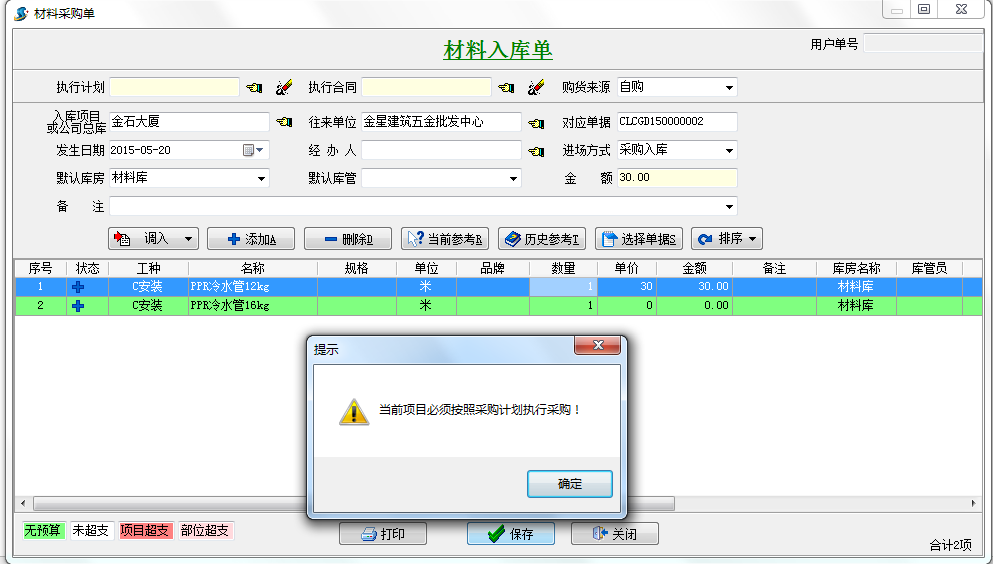 在工程項(xiàng)目管理系統(tǒng)中填入材料入庫單、其他入庫單成本控制金額,當(dāng)超過該金額時(shí),系統(tǒng)會(huì)自動(dòng)提示。假如我們成本控制金額填入30000我們?cè)谛落浫氩牧先霂靻?、其他入庫單時(shí)超過控制金額30000會(huì)自動(dòng)提示。這里咱們一采購入庫單為例,如下圖