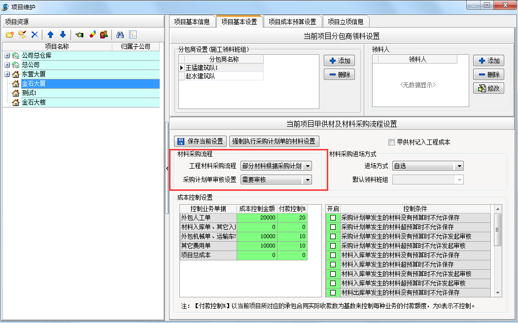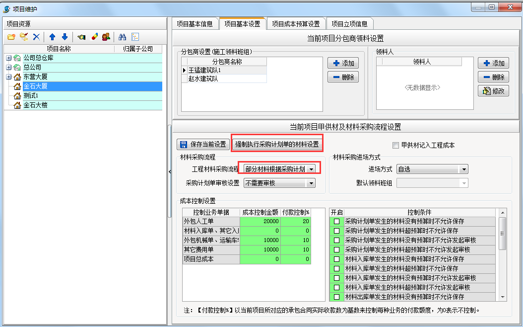在【工程管理】模塊?【項(xiàng)目維護(hù)】項(xiàng)目基本設(shè)置可以設(shè)置采購計(jì)劃單,材料入庫單,材料出庫單,材料調(diào)撥單強(qiáng)制執(zhí)行材料預(yù)算單。如下圖
