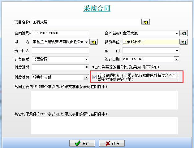 在工程項(xiàng)目管理系統(tǒng)中即通過采購合同驗(yàn)收總額控制選項(xiàng)來控制驗(yàn)收總額。