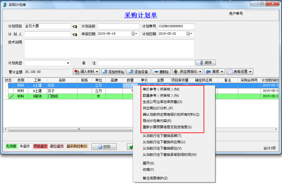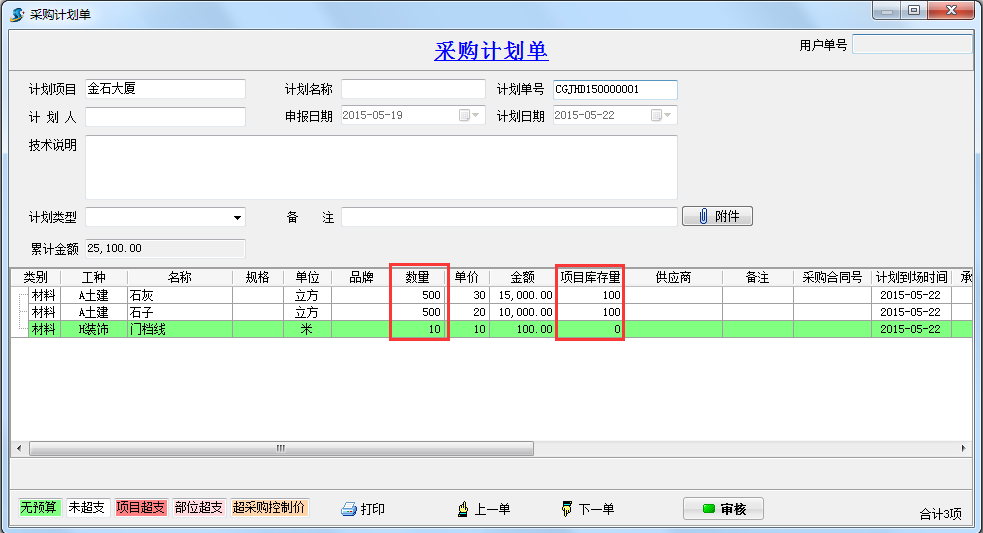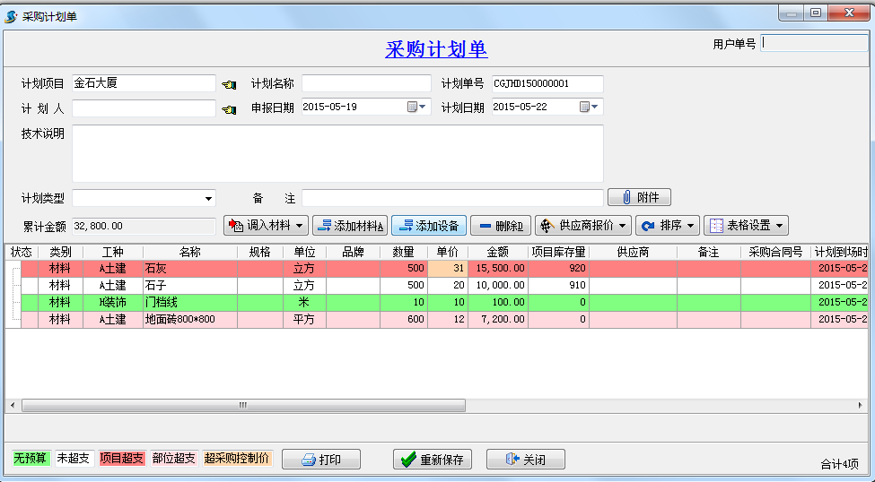 綁定好項(xiàng)目之后,在填寫材料相關(guān)單據(jù)時(shí),會(huì)根據(jù)預(yù)算單的價(jià)格和數(shù)量進(jìn)行不同顏色的顯示。這里我們以采購計(jì)劃單為例進(jìn)行說明。