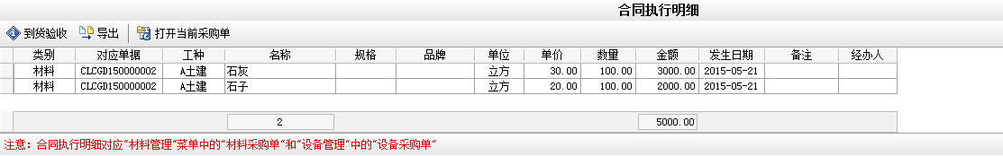 我們對(duì)該合同進(jìn)行驗(yàn)收,生成材料采購單,如下圖