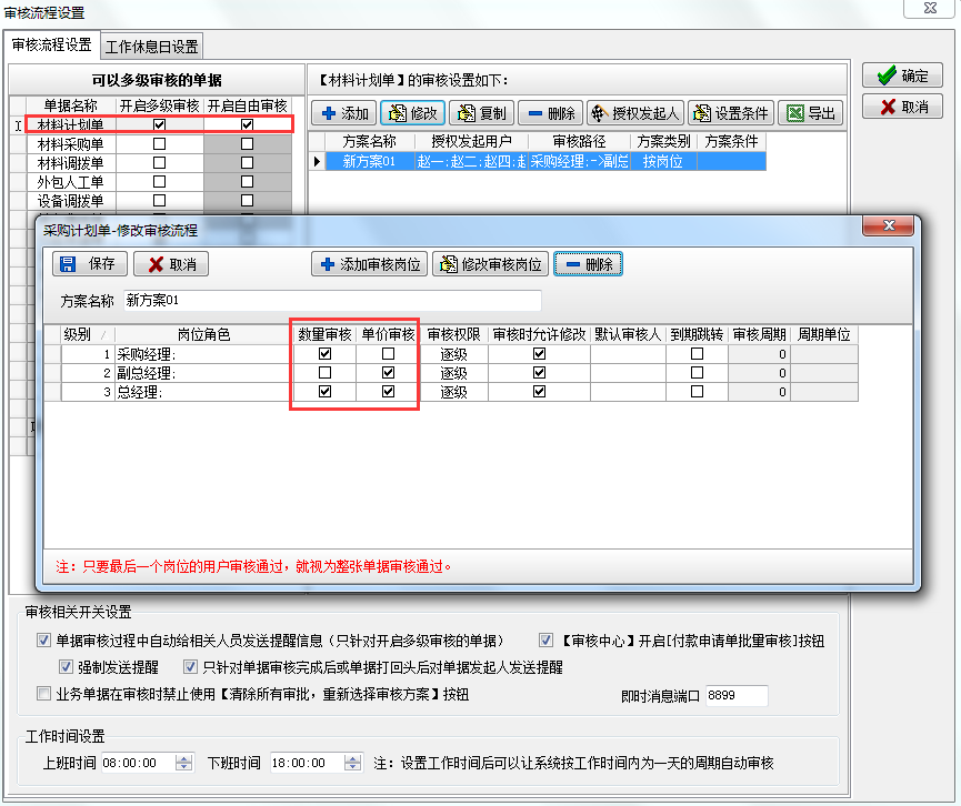 具體設(shè)置方法:材料計(jì)劃單審核設(shè)置為:需要審核。材料采購流程又為:根據(jù)采購計(jì)劃單或者部分材料根據(jù)采購計(jì)劃單