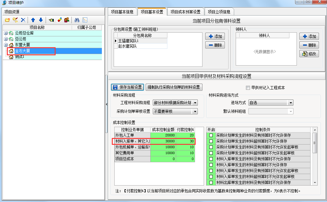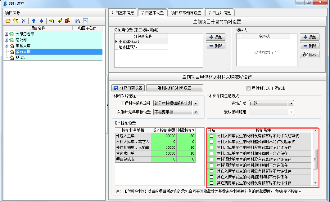 在工程項(xiàng)目管理系統(tǒng)中選好控制條件在開啟處打上勾。例如我們選定材料入庫單發(fā)生的材料沒有預(yù)算不能允許保存。