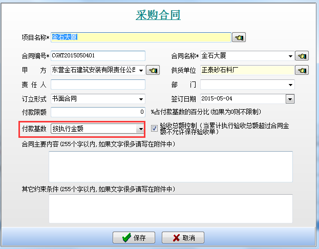 即在工程項(xiàng)目管理系統(tǒng)中新建采購合同時(shí)填寫好付款限額。如下圖: