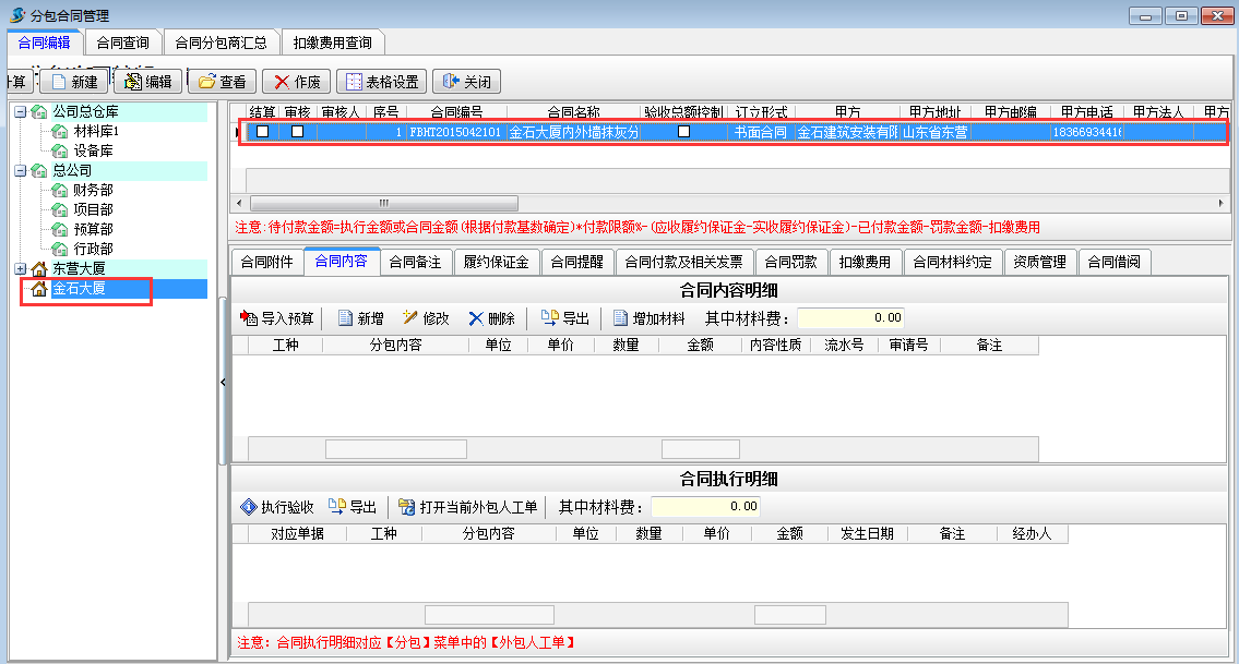 在【合同編輯】中左半部分是合同的分類,分包合同也是按【項(xiàng)目維護(hù)】進(jìn)行分類管理的。一個(gè)項(xiàng)目下可以建立多個(gè)合同,窗口的右上部分是合同列表,一行信息代表一個(gè)合同。右下部位是當(dāng)前合同相關(guān)的內(nèi)容:【合同附件】、【合同內(nèi)容】、【合同備注】、【履約保證金】、【合同提醒】、【合同付款及相關(guān)發(fā)票】、【合同罰款】、【扣繳費(fèi)用】、【合同材料約定】、【資質(zhì)管理】、【合同借閱】。