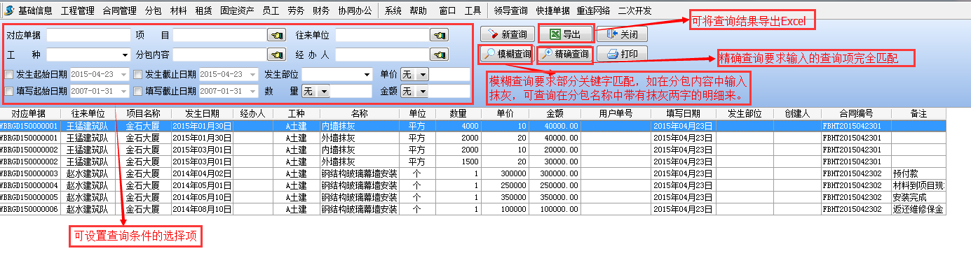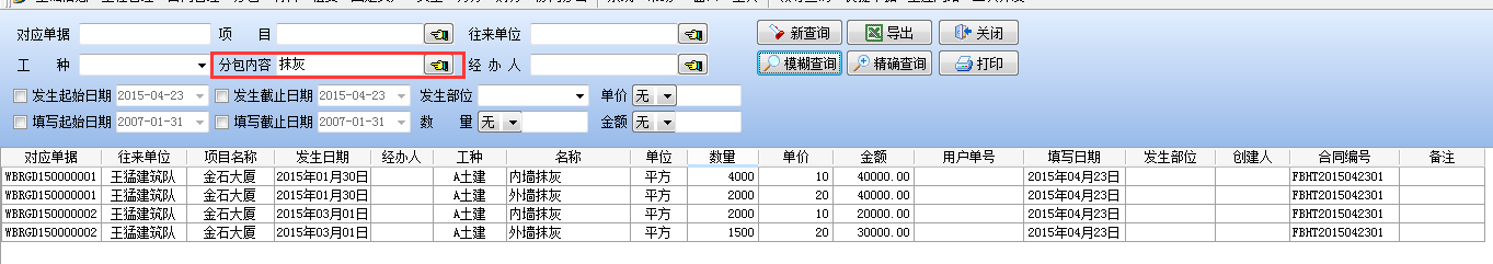 在分包內(nèi)容中輸入"抹灰"點(diǎn)擊【模糊查詢】后結(jié)果如下: