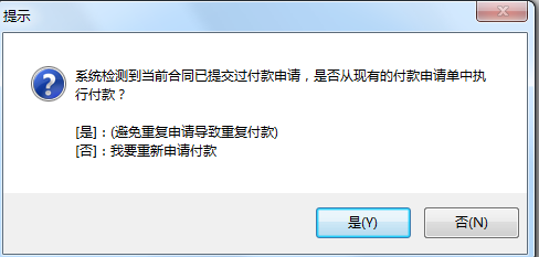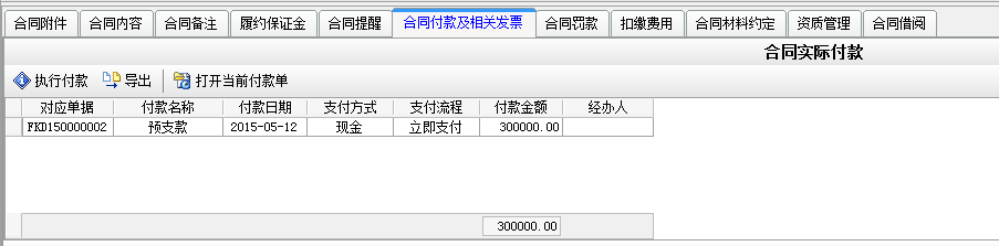 在合同付款及相關(guān)發(fā)票處點(diǎn)擊付款生成付款申請(qǐng)單,系統(tǒng)會(huì)自動(dòng)提示你已有預(yù)付款。