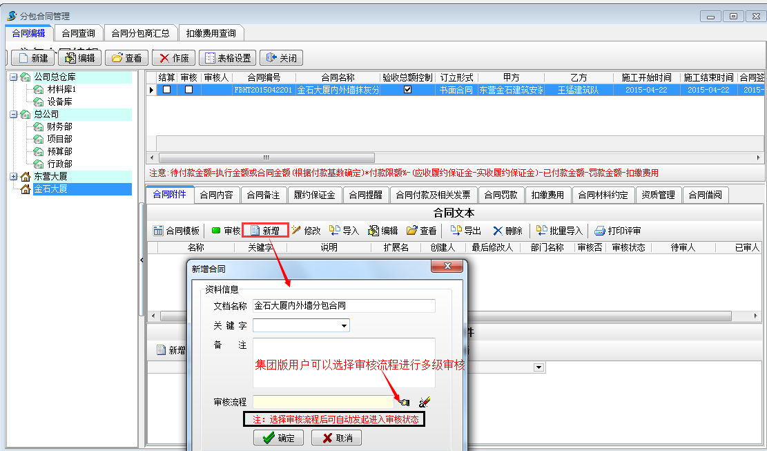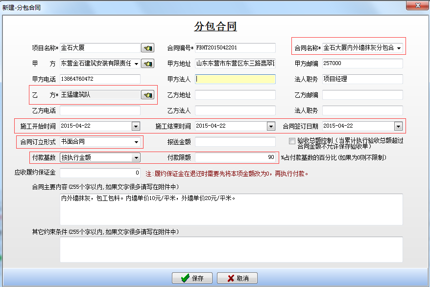 選中[金石大廈]項(xiàng)目點(diǎn)擊【新建】來(lái)建立一個(gè)合同,界面如下: