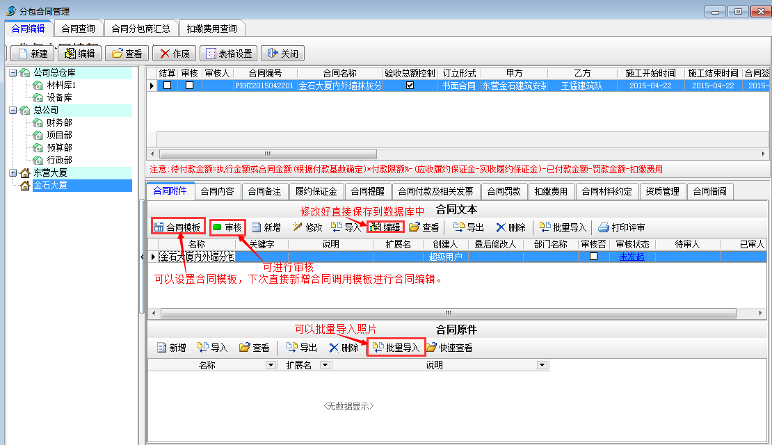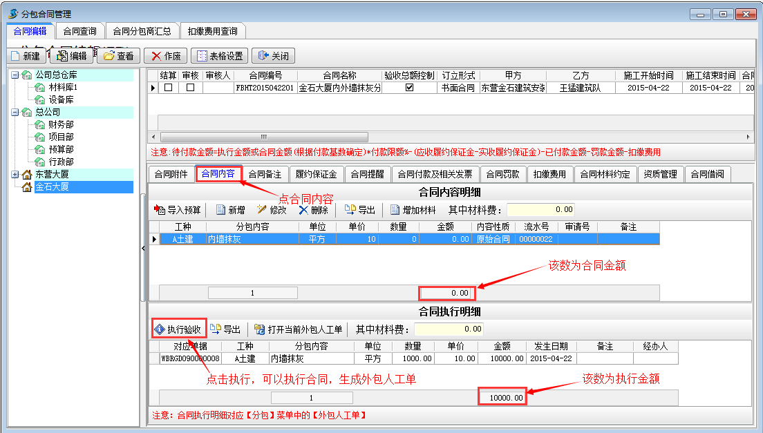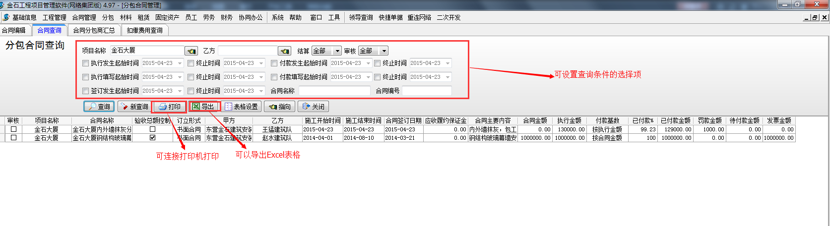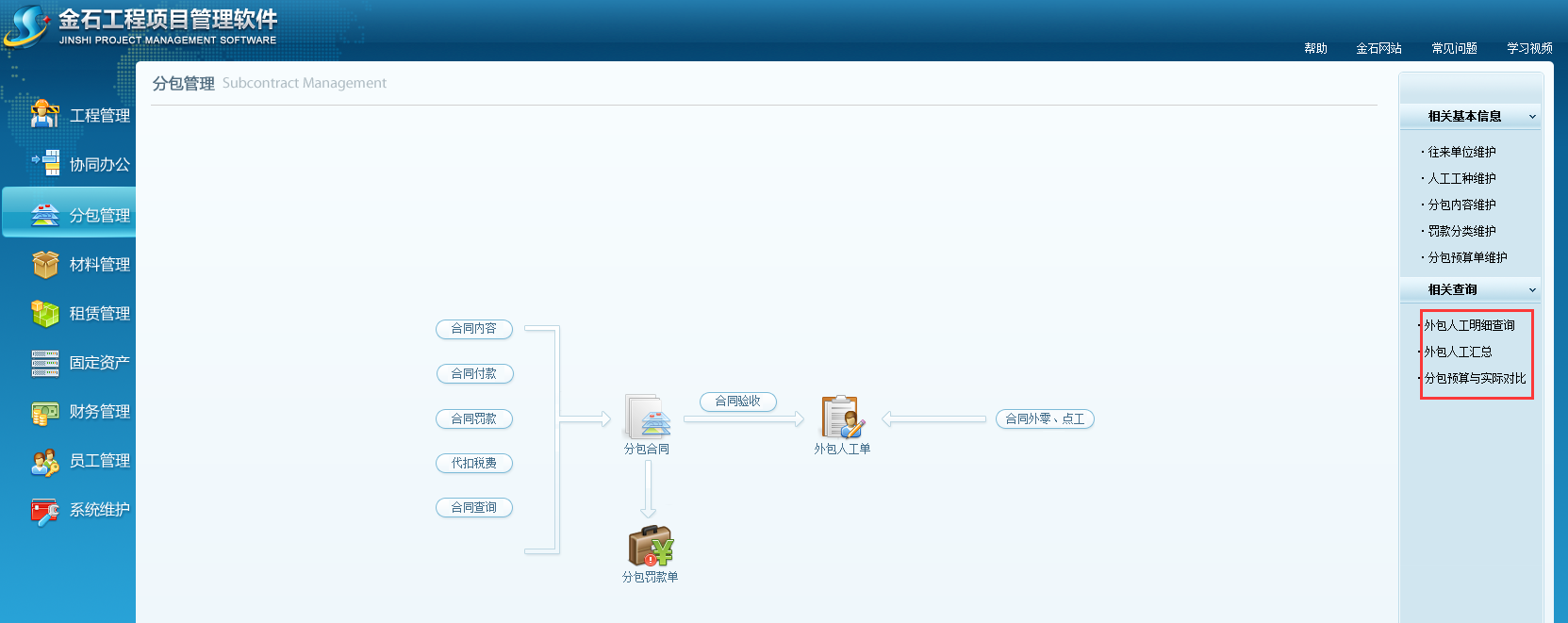 工程項(xiàng)目分包管理合同 是與分包商或施工隊(duì)簽訂的合同,包括【合同編輯】、【合同查詢】、【合同分包商匯總】、【扣繳費(fèi)用查