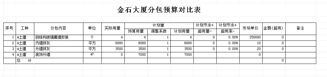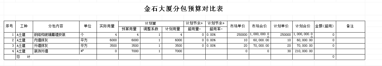 備注:調(diào)整系統(tǒng)說(shuō)明:在實(shí)際的工程量投標(biāo)中,某些施工企業(yè)為了中標(biāo)而做低預(yù)算量,還有其它的原因如:一些分包根據(jù)以往的施工經(jīng)驗(yàn)總會(huì)有一定的偏差。這里用調(diào)整系數(shù)是為了將最終要參與比較的【計(jì)劃用量】、【計(jì)劃用量】調(diào)整到接近于預(yù)期最真實(shí)的值。