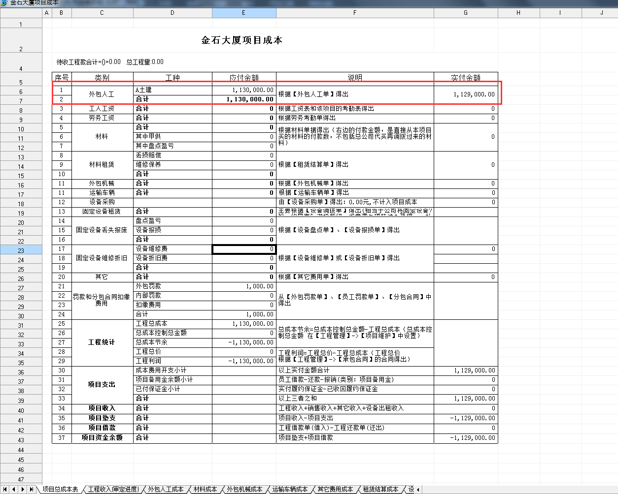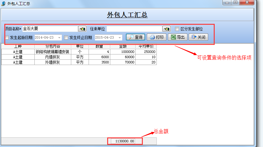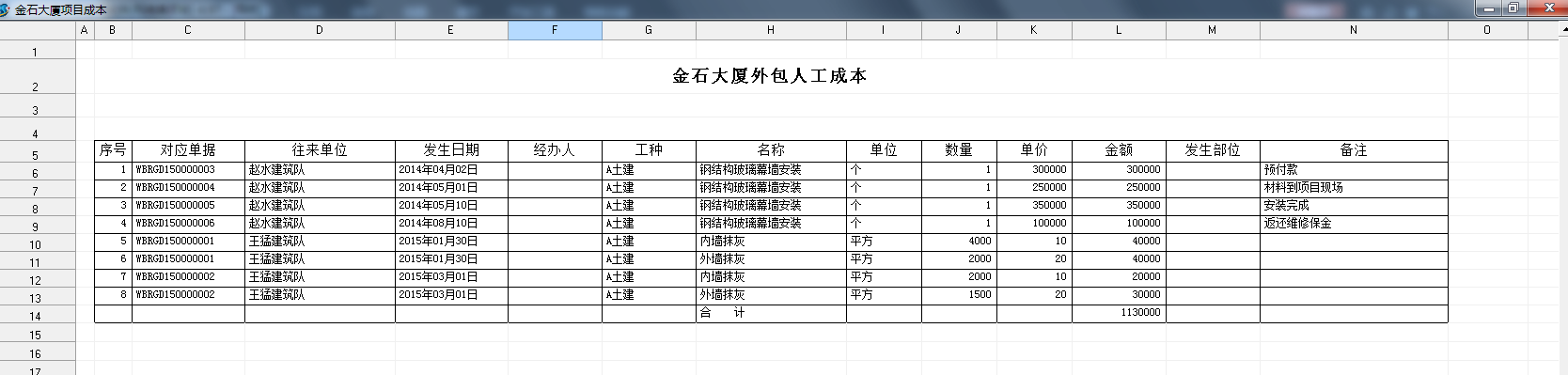 如下圖:查詢項(xiàng)目為【金石大廈】的外包人工成本。