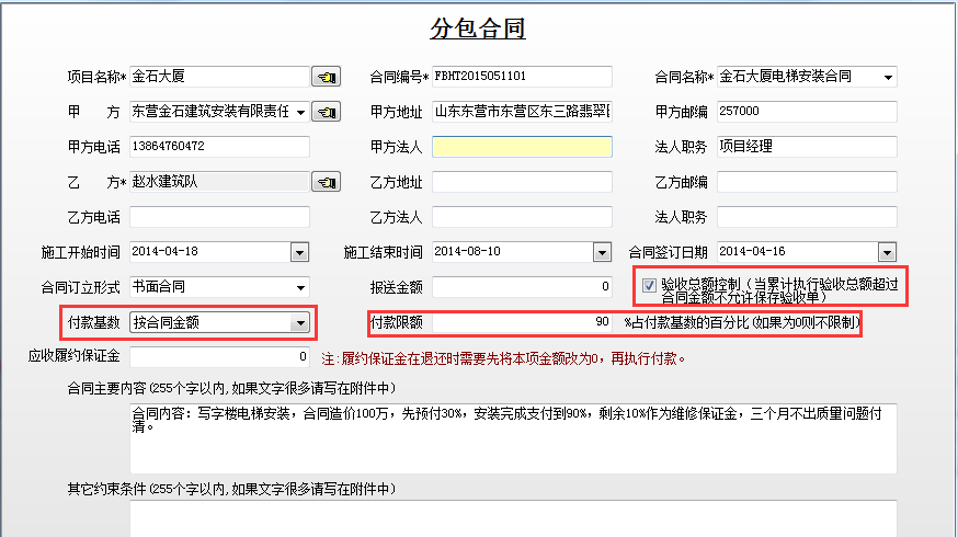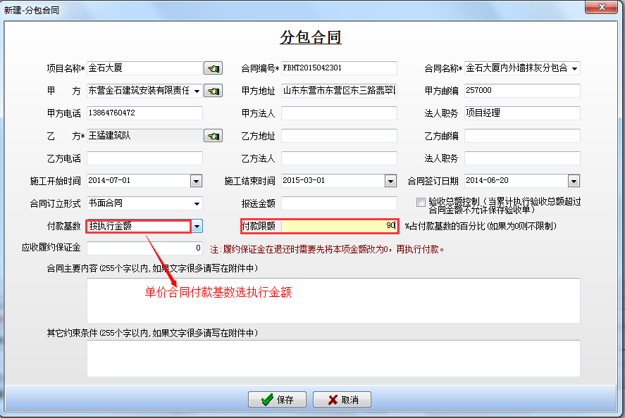上圖帶紅框的注意填寫(xiě)正確,其中帶*為必填項(xiàng)。尤其注意【付款基數(shù)】、【付款限額】這些項(xiàng)都會(huì)直接影響到該合同的待付款。
