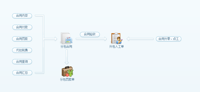工程項(xiàng)目分包管理,可用于統(tǒng)計(jì)專業(yè)分包產(chǎn)生的成本及臨時(shí)雇用的零工成本。如軟件流程圖所示:分包成本是由外包人工單產(chǎn)成,其來(lái)源可分為兩部分,第一:來(lái)自分包合同中的合同驗(yàn)收,第二:來(lái)自合同外零、點(diǎn)工驗(yàn)收。