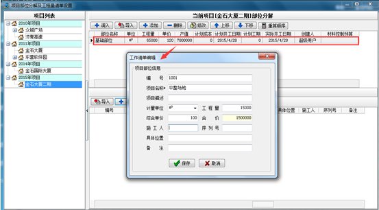 如下圖所示,在彈出的“項(xiàng)目部位分解及工程量清單設(shè)置”窗口中點(diǎn)“添加”按鈕,然后依次填寫項(xiàng)目部位名稱、工程量、單位等相關(guān)信息,