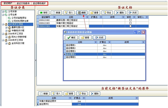操作方法:在窗口左側(cè)選擇要做簽證的項(xiàng)目,在右側(cè)窗口點(diǎn)擊“新建”按鈕,輸入名稱后,點(diǎn)“編輯”按鈕,選擇一個簽證模板后,即可開始編輯簽證文檔。