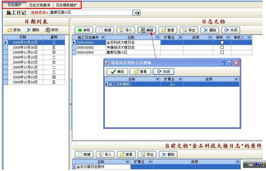 A添加施工日志:首先選擇項(xiàng)目名稱,在“日期列表”下點(diǎn)“添加”按鈕,選擇日期。然后在右側(cè)的“日志文檔”下新建一個日志文檔,然后選擇“編輯”按鈕,選擇一個“日志模板”建立日志文件可記錄工程項(xiàng)目施工進(jìn)度。也可以直接導(dǎo)入已寫好的現(xiàn)成日志文檔到軟件中,或者將寫在日記本的日志用數(shù)碼相機(jī)或掃描儀做成圖片格式直接導(dǎo)入到軟件中。