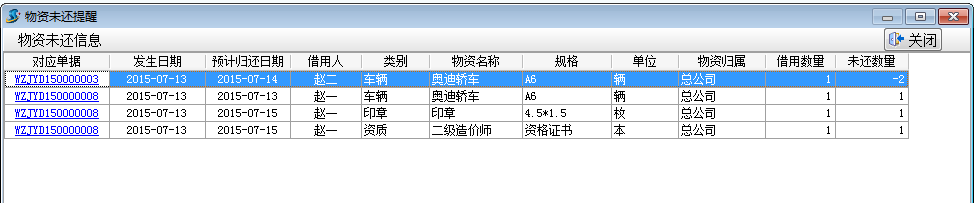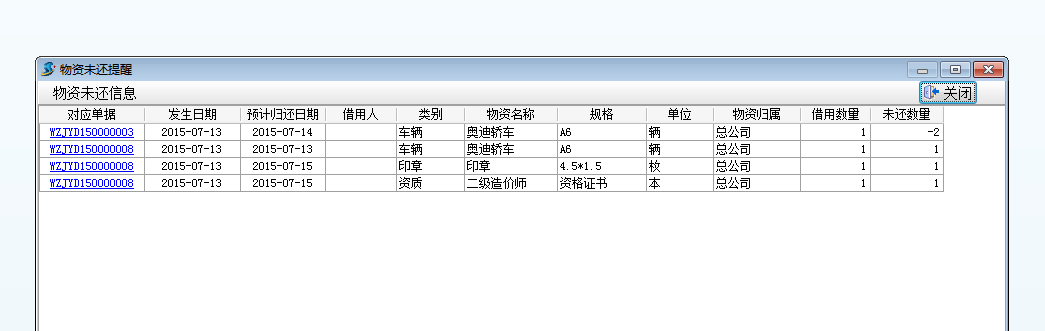在填寫(xiě)物資借用單時(shí),填寫(xiě)好預(yù)計(jì)歸還日期,當(dāng)?shù)筋A(yù)計(jì)歸還日期時(shí),會(huì)自動(dòng)提醒物資未還信息。如下圖: