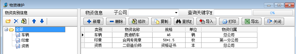 工程項(xiàng)目物資管理可用于管理車(chē)輛,印章,證書(shū),資質(zhì),設(shè)備,辦公用品等物資的入庫(kù),報(bào)損,借用,歸還等過(guò)程。錄入相關(guān)單據(jù)前,需先錄入要用到的基礎(chǔ)信息中的【物資維護(hù)】【子公司信息維護(hù)】。