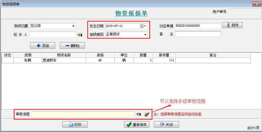 【物資報(bào)損單】是用來(lái)報(bào)損物資的業(yè)務(wù)單據(jù)。 類(lèi)似【材料報(bào)損單】或者【設(shè)備報(bào)損單】,一個(gè)是針對(duì)物資報(bào)損,一個(gè)是針對(duì)材料或者設(shè)備報(bào)損。