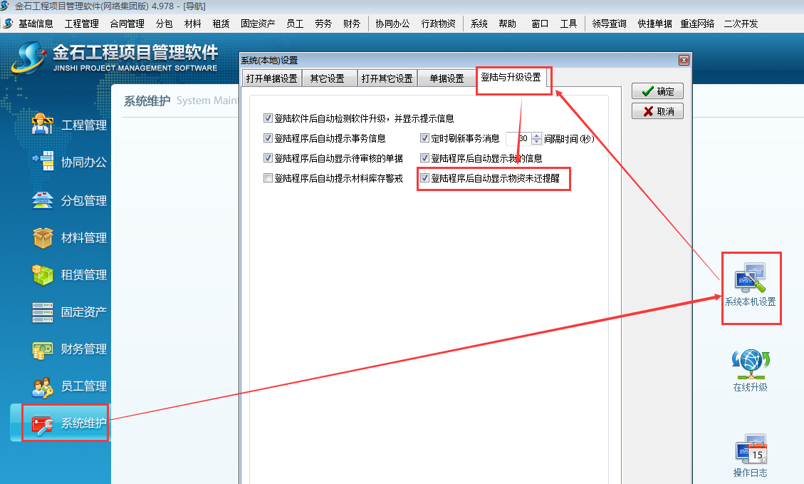還可以設(shè)置登錄客戶端后自動(dòng)顯示物資未還提醒。