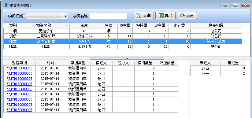 物資庫(kù)存統(tǒng)計(jì)可以很方便查詢物資的借還記錄,物資借還人以及物資的未還量。當(dāng)物資借用人想借用物資時(shí),可以先查看物資庫(kù)存統(tǒng)計(jì),方便借用物資。