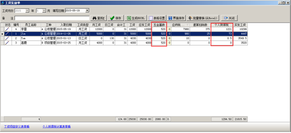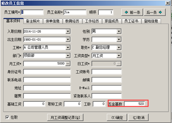 在工程項目管理軟件中生成工資表之前需要在員工維護里面設置好員工的“五金基數(shù)”,如圖: